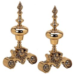 Coppia di alari da camino in Massiccio ottone anticato, importante impugnatura stile Barocco il cui stampo ha oltre 200 anni di storia ed oggi presente nei migliori salotti del mondo.Si consiglia l’uso del brucialegna universale (B-201/7) per un migliore contenimento della legna