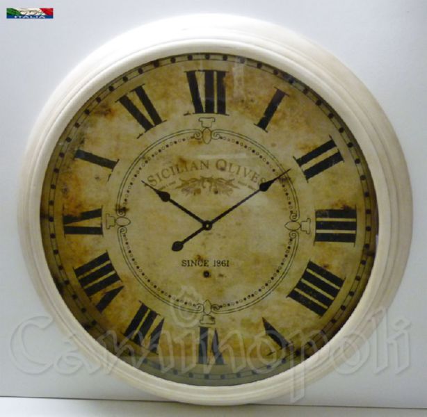 Orologio da Parete, sopracamino di grande diametro, realizzato in metallo stampato con quadrante invecchiato, numeri romani e lancette sotto vetro. Bello sulla parete del vostro salone, ingresso o cucina.