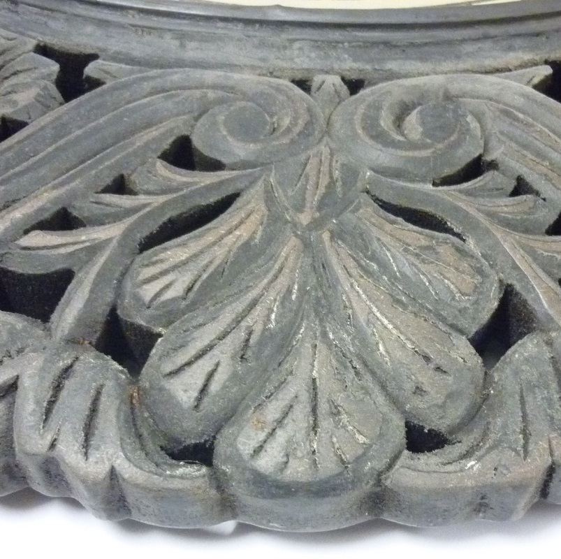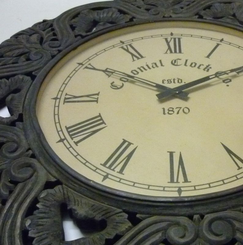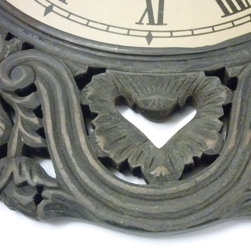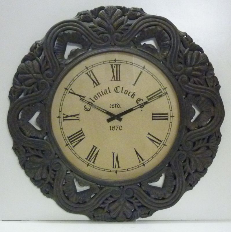 Orologio da parete o Sopra Camino di forma circolare di grande taglia con cornice in pasta di legno di colore grigio marcio con numeri romani.