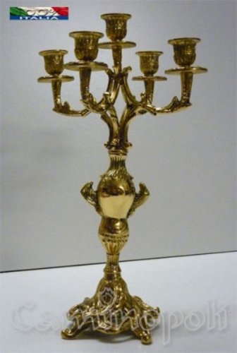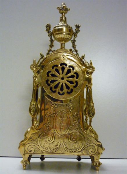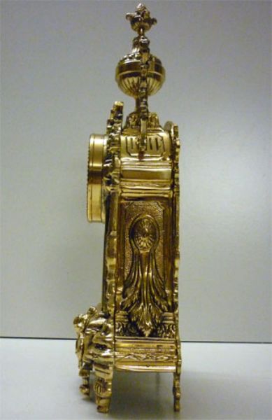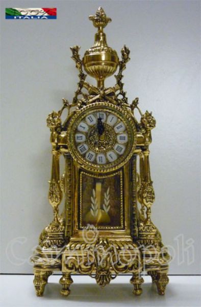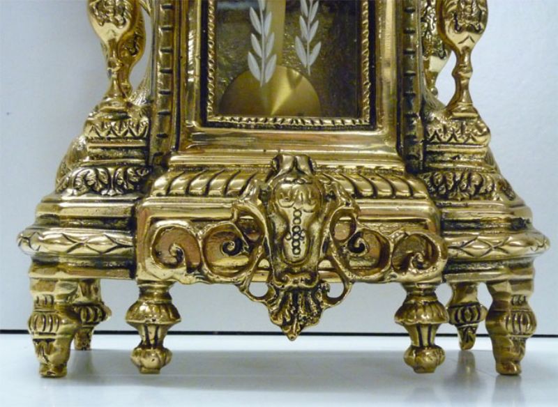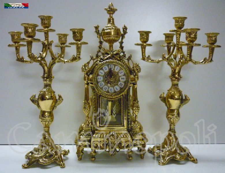 Trittico composto da orologio con pendolo ed una coppia di candelieri, ogni candelabro ospita 5 candele ed insieme all’orologio che monta oggi movimento al quarzo sono rifiniti fronte/retro, questo significa che posti davanti ad una specchiera si esporranno nella loro massima bellezza, realizzati in massiccio bronzo e proposti nella finitura lucida.
