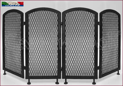 Parascintille 4 ante in ferro forgiato e battuto interamente a mano, composto da quattro ante uguali e si raccoglie a fisarmonica nei spostamenti.Ognuna delle quattro parti è composta da cornice, rete decorativa a maglia larga, rete protettiva a maglia stretta e contro cornice, il tutto chiodato a mano come si faceva più di cento anni fa.Il ferro è privo di qualsiasi processo industriale, è rustico ed usando questi attrezzi avrete il piacere di sentire tra le mani la fatica dell’artigiano che lo ha realizzato.