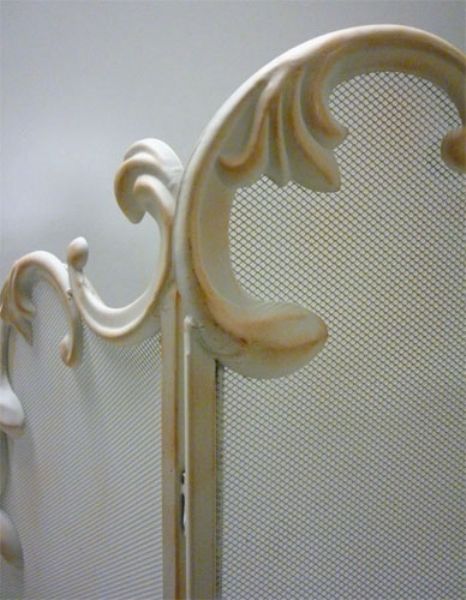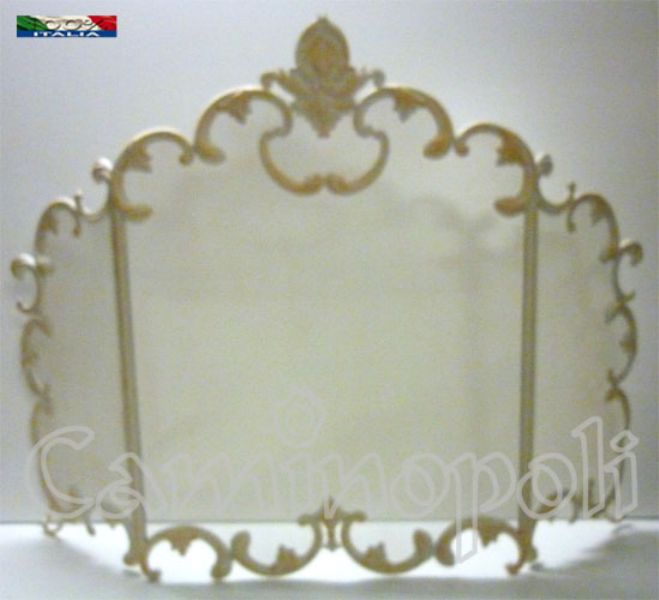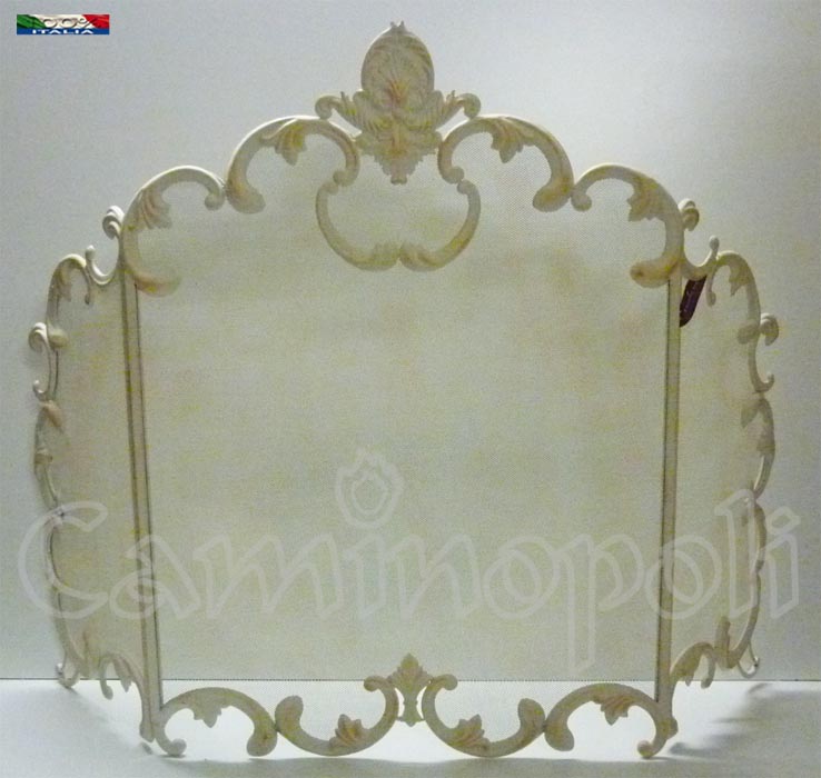 Parascintille e Copricamino in stile barocco, realizzato in ferro stampato e decorato a mano, il suo colore sembra come se fosse segnato dal tempo.Le tre parti misurano: 30+64+30
