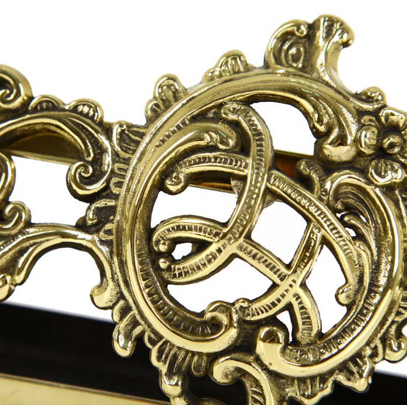 Raccoglicenere in ottone che si posiziona fuori dalla bocca del camino al fine di contenere quella cenere che potrebbe uscire fuori, a proteggere il pavimento o anche solo per il completamento dell’astetica.