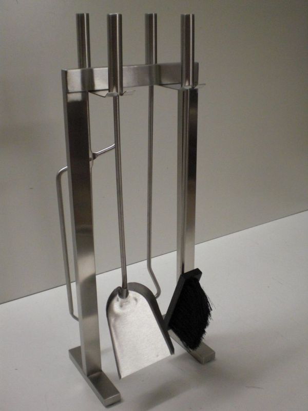 Set attrezzi per un camino moderno, realizzato in acciaio satinato e composto da paletta, attizzatoio, spazzola e pinza.Sobrio e semplice, leggero e comodo per i piccoli spostamenti.