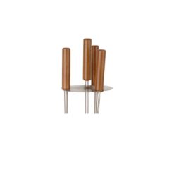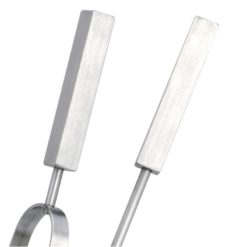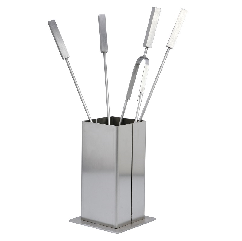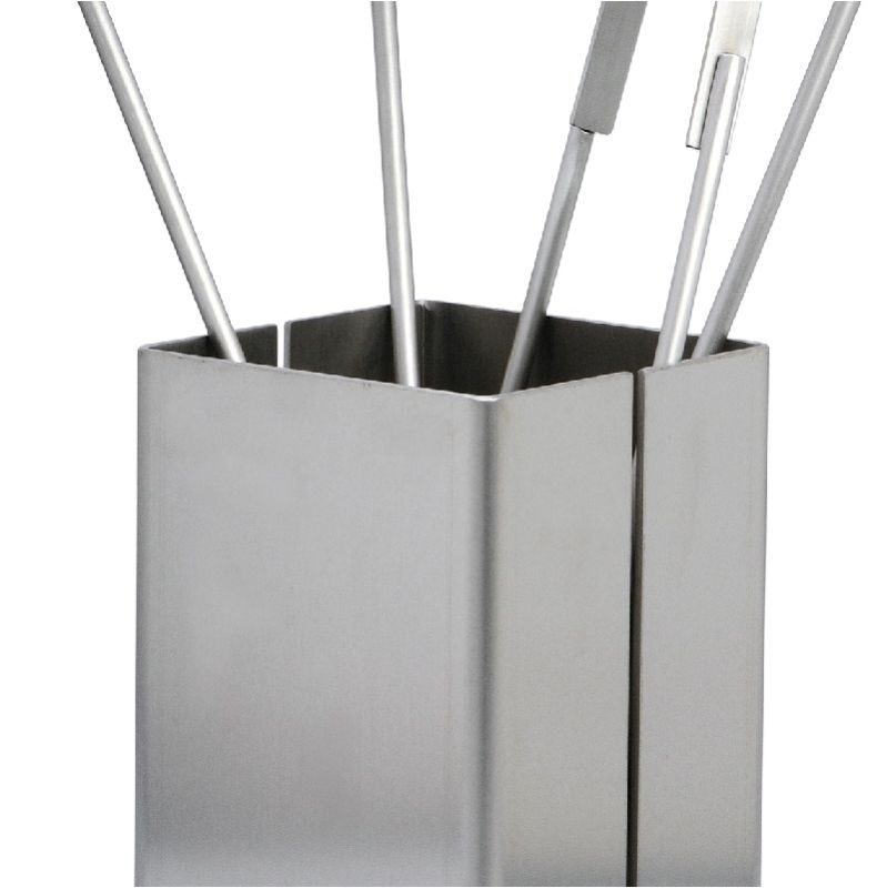 Set di attrezzi 4+1 pezzi e realizzato interamente in acciaio satinato, composto da contenitore di forma quadra con gli attrezzi anche loro con impugnatura di forma quadra, Scopino, Paletta, Pinza ed Attizzatoio.