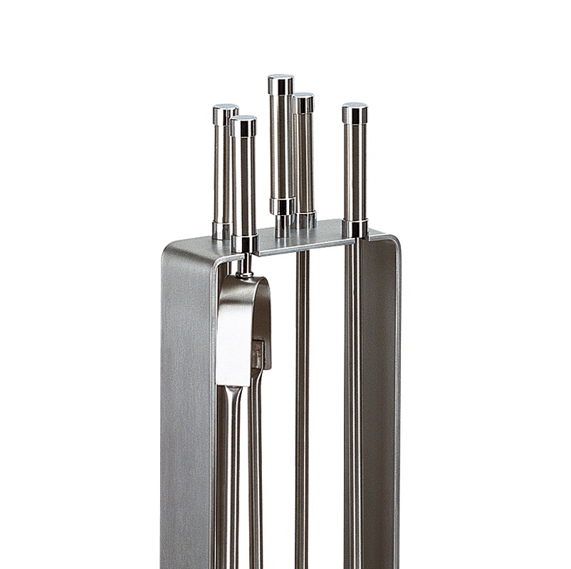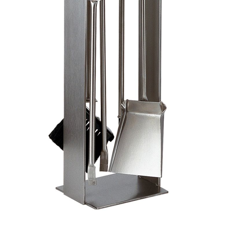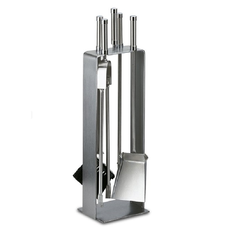 SET in ACCIAIO INOX. Set di attrezzi 4+1 realizzato interamente in acciaio con struttura solida e decisa. Trespolo composto da quattro utensili: Attizzatoio Scopino Paletta Pinza