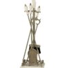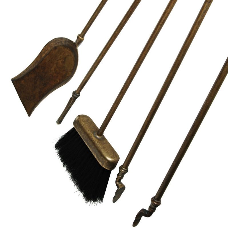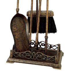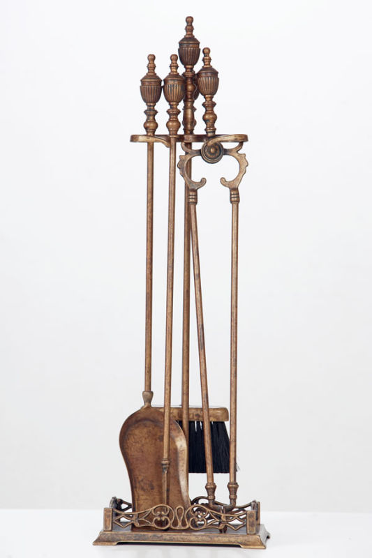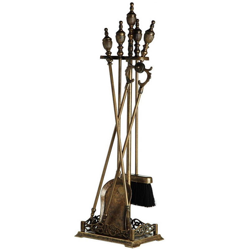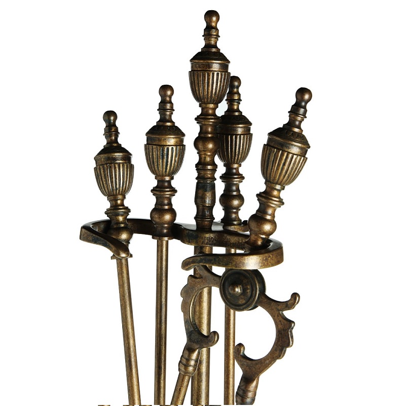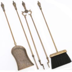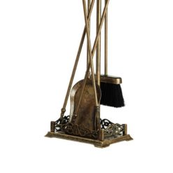 Set di attrezzi da camino in Massiccio ottone con finitura Anticata, composto da 4 accessori ed il trespolo, la cui base funge da vaschetta raccogli cenere, importante impugnatura stile impero il cui stampo ha oltre 200 anni di storia ed oggi presente nei migliori salotti del mondo.