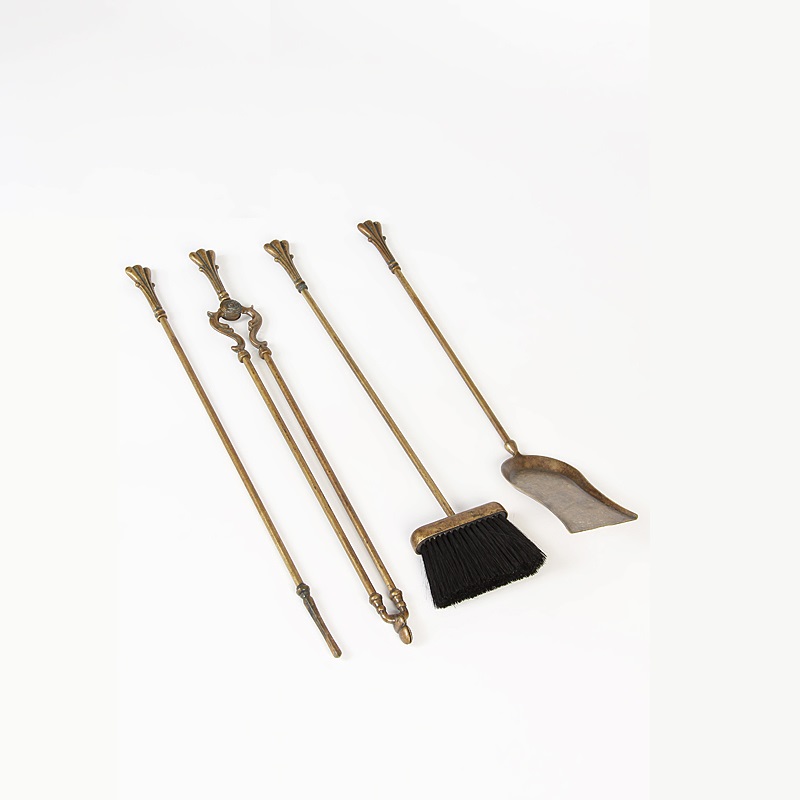 Set di attrezzi camino 4+1 pezzi realizzato interamente in ottone, stile rinascimento.