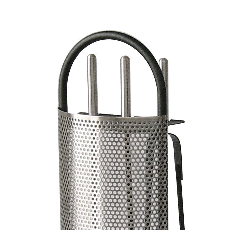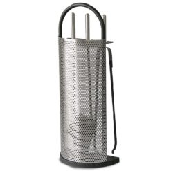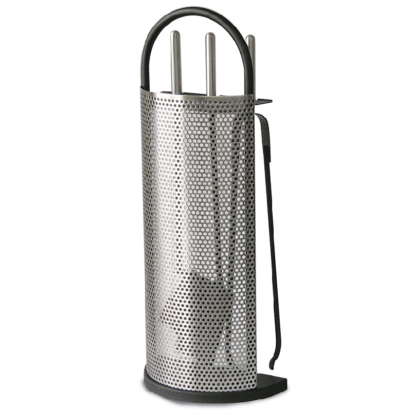 SET moderno in Acciaio Inox. Set di attrezzi in Acciaio con dettagli verniciati di nero e composto da: Scopino Paletta Pinza La maschera traforata e le 3 impugnature sono in acciaio inox satinato. CO