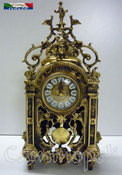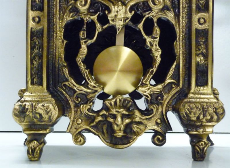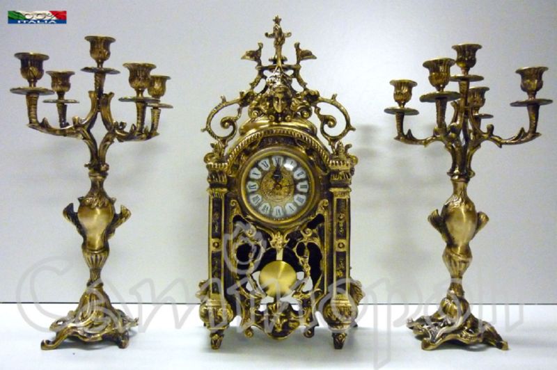 Trittico composto da orologio con pendolo ed una coppia di candelieri, ogni candelabro ospita 5 candele ed insieme all’orologio che monte oggi movimento al quarzo sono rifiniti fronte/retro, questo significa che posti davanti ad una specchiera si esporranno nella loro massima bellezza, realizzati in massiccio bronzo e proposti nella finitura brunita.