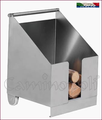 Portalegna Trolley in acciaio, che grazie alle due ruote posteriori ed al comodo maniglione si rende estremamente comodo per gli spostamenti ed il trasporto della legna in casa.